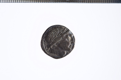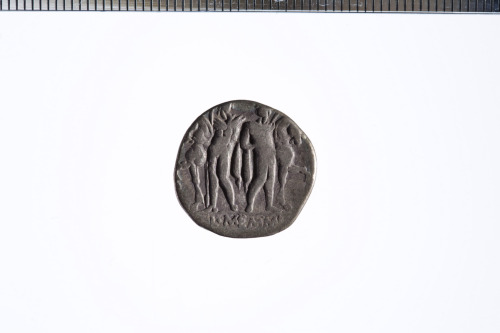 Dritto: Testa di un giovane coronata da una corona di quercia a d. (Apollo?); sotto al mento, un asterisco ; c.p.. Rovescio: I Dioscuri stanti di fronte, in mezzo ai loro cavalli, ognuno reggente una lancia; c.p.