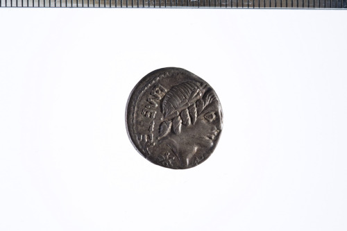 Dritto: Testa laureata di Apollo a d.; sotto il collo, X barrato; c.p.. Rovescio: Roma seduta a s. su una pila di scudi, che regge una spada con la mano s. e una lancia con la d., e che viene incoronata da una vittoria; c.p.