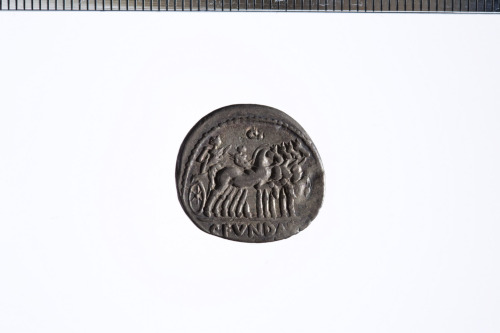 Dritto: Testa galeata di Roma a d.;c.p.. Rovescio: Triumphator in quadriga a d. che regge un ramo di alloro con la s. e un bastone nella d.; nel cavallo più vicino è seduto un cocchiere che regge un ramo d'alloro; c.p.