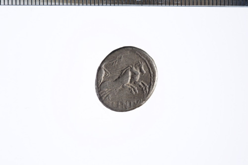 Dritto: Busto di Marte con elmo corinzio visto da dietro con la testa volta a d., con una lancia sulla spalla s. e una spada sulla d.; c.p.. Rovescio: Vittoria in biga a d. che regge le redini con la s. e una corona con la d.; c.p.