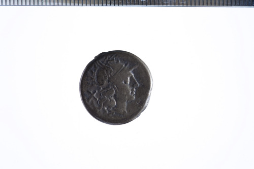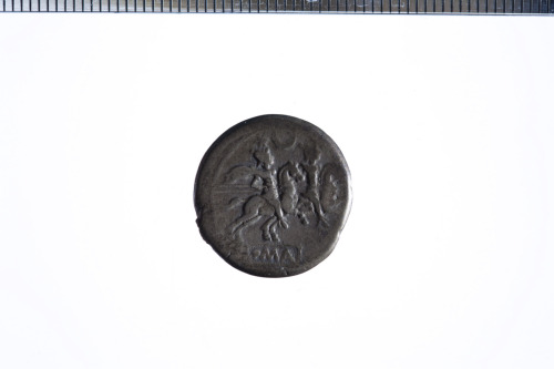 Dritto: Testa galeata di Roma a d.; dietro simbolo di valore X; c.p.. Rovescio: Dioscuri appaiati al galoppo a d.; es. ROM[A]; tra le teste dei Dioscuri un crescente lunare; c.p.