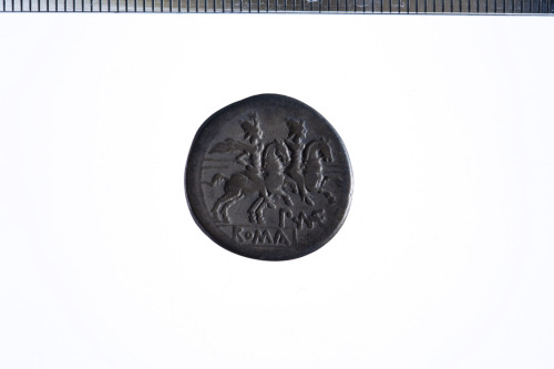 Dritto: Testa galeata di Roma a d.; dietro simbolo di valore X; c.p.. Rovescio: Dioscuri appaiati al galoppo a d.; es. ROMA in contorno lineare