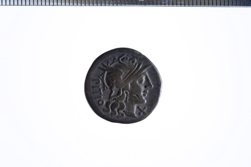 Dritto: Testa galeata di Roma a d.; davanti simbolo di valore X; c.p.. Rovescio: Dioscuri appaiati al galoppo a d.; es. ROMA