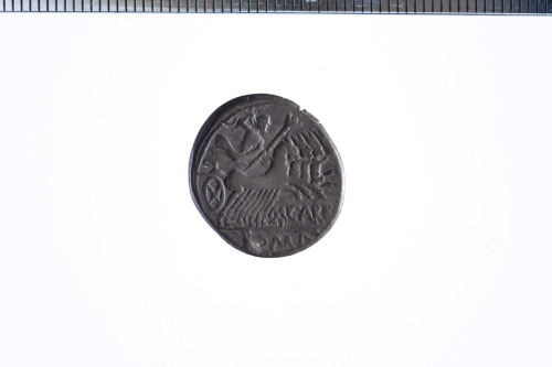Dritto: Testa elmata di Roma a d.; davanti simbolo di valore X; dietro ramo c.p.. Rovescio: Giove in quadriga verso d. con saetta nella d. e redini nella s.; es. ROMA