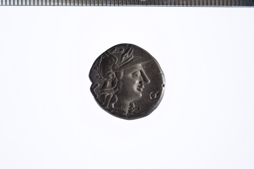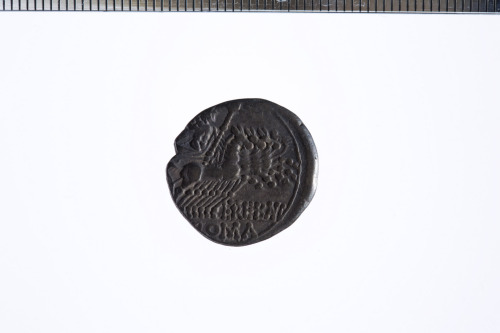 Dritto: Testa elmata di Roma a d.; dietro simbolo di valore X, c.p.. Rovescio: Giove in quadriga verso d. con scettro e redini nella s. e saetta nella d.; es. ROMA