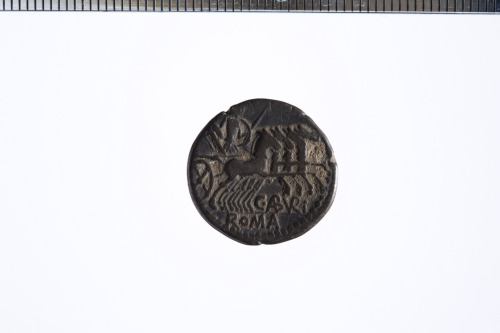 Dritto: Testa elmata di Roma a d.; davanti simbolo di valore X barrato; c.p.. Rovescio: Marte su quadriga a d. con lancia, scudo e redini nella s, regge un trofeo con la d.; es. ROMA
