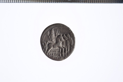 Dritto: Testa elmata di Roma a d.; davanti simbolo di valore X barrato; c.p.. Rovescio: Giove su quadriga a d.; es. ROMA