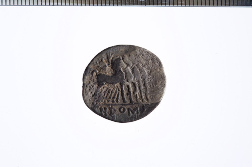 Dritto: Testa elmata di Roma a d., dietro simbolo del valore X; c.p.. Rovescio: Giove in quadriga verso d. con scettro nella s. e saetta nella d.; es. CN.DOMI