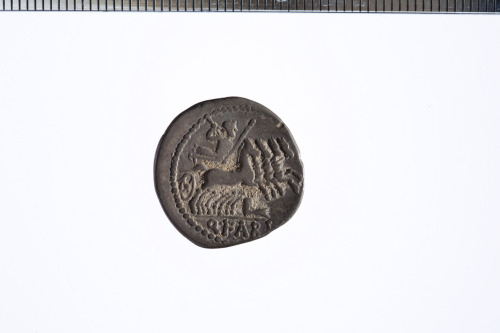 Dritto: Testa elmata di Roma a d., davanti simbolo di valore X, c.p.. Rovescio: Giove su quadriga verso d.; sotto rostro di nave; es. Q.FABI