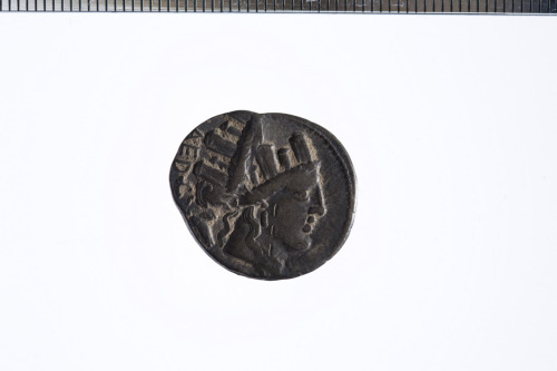 Dritto: Testa con corona turrita di Cybele a d.; dietro, un piede volto verso l'alto; c.p.. Rovescio: Sedia curule; c.p.