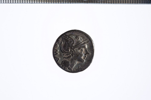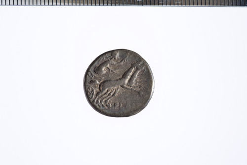 Dritto: Testa elmata di Roma a d., davanti simbolo di valore X, c.p.. Rovescio: Vittoria su biga a d., tiene redini con la s. e una corona con la d., es. [---]