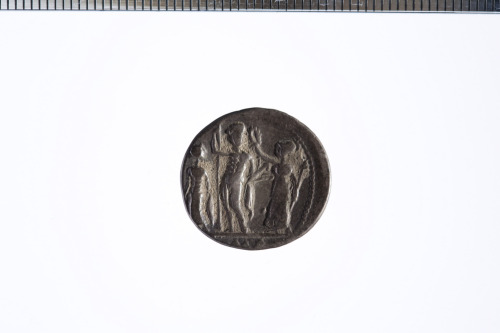 Dritto: Testa elmata di Marte a d. con elmo corinzio, sopra simbolo di valore X barrato; dietro caduceo. Rovescio: Giove stante tra Giunone e Minerva con scettro nella d. e saetta nella s. Minerva lo incorona con la d. e regge scettro a s. Giunone tiene scettro con la d.; tra Minerva e Giove segno di controllo: punto; es. [ROMA]