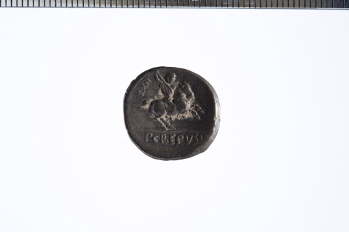 Dritto: Testa laureata di Apollo? a d. con dietro uno scettro; davanti simbolo non visibile; c.p.. Rovescio: Cavaliere al galoppo a d. brandendo una lancia; c.p.