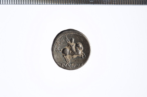 Dritto: Testa laureata di Apollo? a d. con dietro uno scettro; davanti un grappolo d'uva?; c.p.. Rovescio: Cavaliere al galoppo a d. brandendo una lancia; c.p.