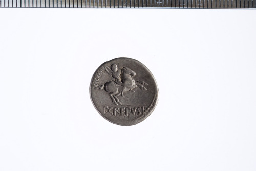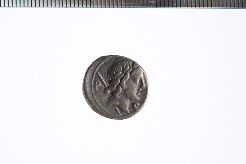 Dritto: Testa laureata di Apollo ? a d. con dietro uno scettro; davanti un oggetto rotondo; c.p.. Rovescio: Cavaliere al galoppo a d. brandendo una lancia; c.p.