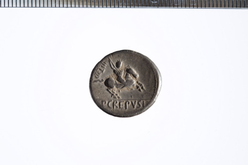 Dritto: Testa laureata di Apollo? a d. con dietro uno scettro; davanti un simbolo non meglio identificabile; c.p.. Rovescio: Cavaliere al galoppo a d. brandendo una lancia; c.p.