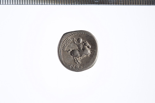 Dritto: Testa laureata di Apollo? a d. con dietro uno scettro; davanti un simbolo non meglio identificabile; c.p.. Rovescio: Cavaliere al galoppo a d. brandendo una lancia; c.p.