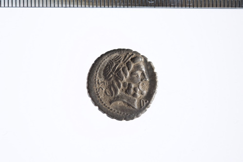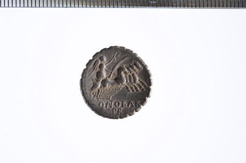 Dritto: Testa laureata e barbata di Giove a d.; c.p.. Rovescio: Vittoria in quadriga a d. che regge le redini e un ramo di palma con la mano s. e una corona con la d.; c.p.