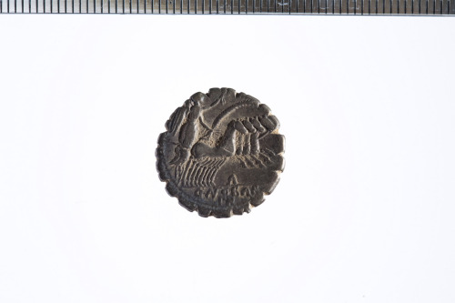 Dritto: Testa laureata e barbata di Giove a d.; c.p.. Rovescio: Vittoria in quadriga a d. che regge le redini e un ramo di palma con la mano s. e una corona con la d.; c.p.