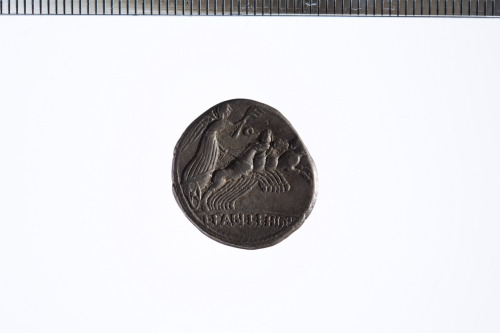 Dritto: Busto femminile, drappeggiato e diademato a d.; davanti una bilancia; dietro, un caduceo alato; c.p.. Rovescio: Vittoria in quadriga a d., che regge le redini con la mano s. e un ramo di palma con la d.; c.p.