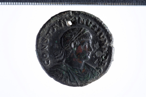 Dritto: Busto elmato con alta cresta di Costantino a s. con corazza, scudo e spada. Rovescio: Due Vittorie alate reggono uno scudo su colonna, es. [ROM]