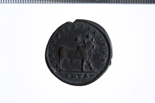 Dritto: Busto elmato con alta cresta di Costantino a s. con corazza, scudo e spada. Rovescio: Due Vittorie alate reggono uno scudo su colonna, es. [ROM]