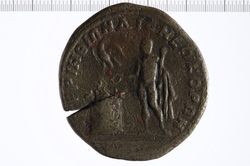 Dritto: Busto di Elagabalo a d. laureato, con corazza.. Rovescio: Eracle, nudo, stante a s. con patera e clava, pelle di leone sul braccio s., sacrifica su altare acceso con ghirlanda; nel campo a s. è un'aquila ad ali spiegate.