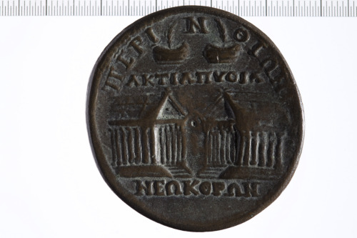 Dritto: Busto di Caracalla a d. laureato, con paludamentum.. Rovescio: Due templi l'uno di fronte all'altro; sopra due urne da premio contenenti palme.