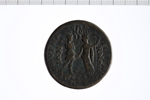 Dritto: Testa laureata di Caracalla a d.. Rovescio: Smirne e Pergamo l'una di fronte all'altra cje si stringono la mano: la prima, rivolta a d., appare come una amazzone, turrita, con bipenne sulla spalla s.; l'altra turrita, verso s., indossa lungo chitone con peplo e regge lo scettro.