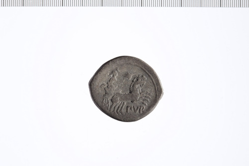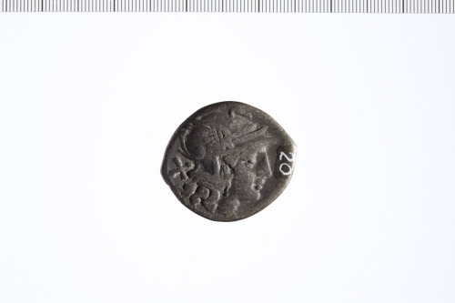Dritto: Testa di Roma con elmo a d., contorno perlinato.. Rovescio: Luna in biga a d. con briglia del cavallo più vicino nella amno s. e quella del cavallo più lontano nella d. insieme ad un bastone. Sopra un murex. Contorno lineare.