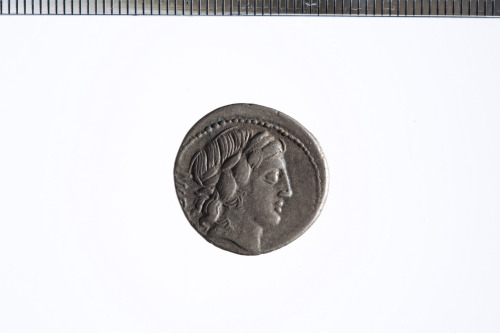 Dritto: Testa laureata di Apollo a d. con sotto un fulmine; c.p.. Rovescio: Cupido su un caprone a d.; sopra i pilei ; in esergo un thyrsus, in tutto all'interno di una corona d'alloro; c.p.