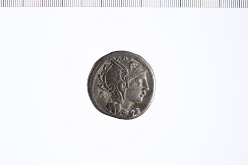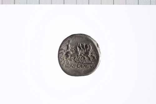 Dritto: Testa di Roma con elmo a d., a s. figura quadrangolare. Contorno perlinato.. Rovescio: Vittoria in triga a d. con briglie in entrambe le mani. Contorno perlinato.