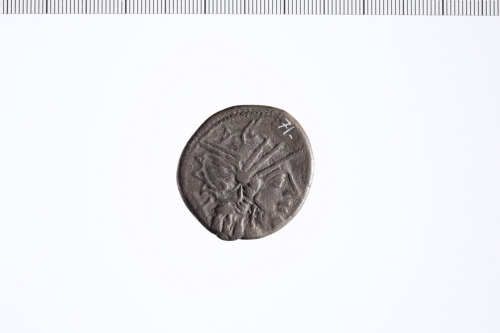Dritto: Testa di Roma con elmo a d. Contorno perlinato.. Rovescio: Dioscuri a d. Contorno perlinato.