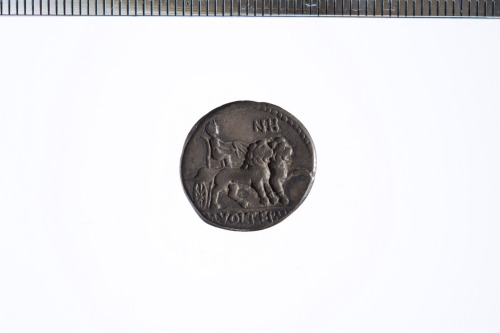 Dritto: Busto elmato e laureato a d.; dietro, un simbolo che non si vede ma deve essere un granchio; c.p.. Rovescio: Cibele velata e con corona turrita in biga di leoni a d. che regge una torcia con ambo le mani; c.p.