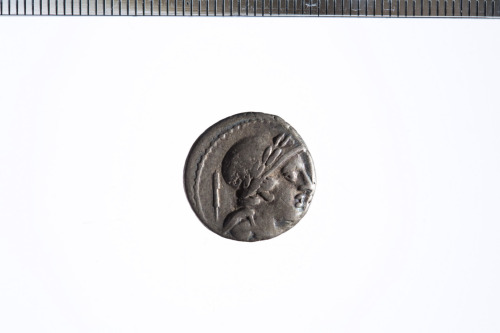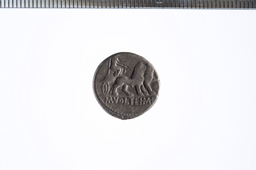 Dritto: Busto elmato e laureato a d.; dietro, un simbolo che potrebbe essere interpretato come uno stilus(?); c.p.. Rovescio: Cibele velata e con corona turrita in biga di leoni a d. che regge una torcia con ambo le mani; c.p.