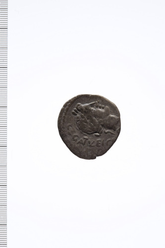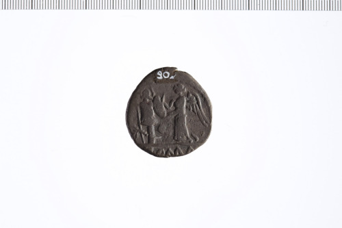 Dritto: Testa di Apollo laureata a d. Contorno perlinato.. Rovescio: Vittoria a s. che scrive su uno scudo attaccato ad un trofeo, accanto carnyx. Contorno perlinato.