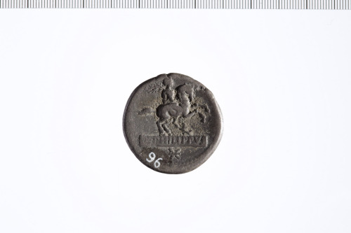 Dritto: Testa maschile a d. con elmo con corna da capra e diadema. Contorno perlinato.. Rovescio: Statua equestre, cavaliere con palma, fiori ai piedi dei cavalli. Contorno perlinato.