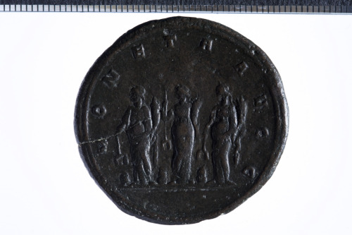 Dritto: Busto laureato e drappeggiato di Diocleziano a d.; contorno perlinato.. Rovescio: Le tre Monetae stanti frontalmente rivolte a s. con cornucopia e bilancia, ciascuna davanti a un altare a cceso; contorno perlinato.