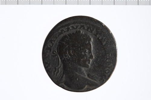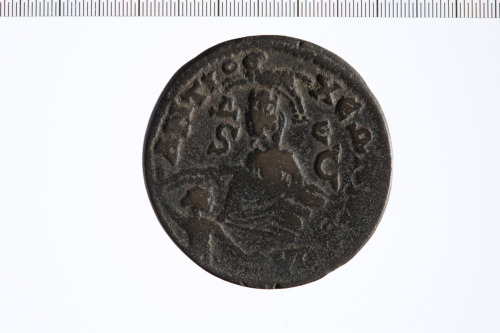 Dritto: Testa di Elagabalo a d. laureato. Rovescio: Figura femminile con chitone, peplo e turrita, seduta su roccia a s., con la mano d. regge spiga di grano, la s. è appoggiata sulla roccia; ai suoi piedi divinità fluviale, Oronte ?, che nuota, sopra ariete che corre verso s. con la testa a d.