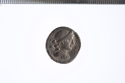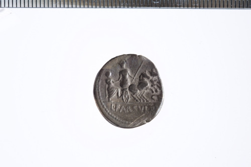 Dritto: Busti diademato e drappeggiato della Libertas a d.; dietro, un pileus.; bordo di astragali.. Rovescio: Guerriero con lancia regge le redini su una biga a d. con la mano s.; con la d. aiuta a salire una figura togata sulla biga; sotto i cavalli, C; c.p.