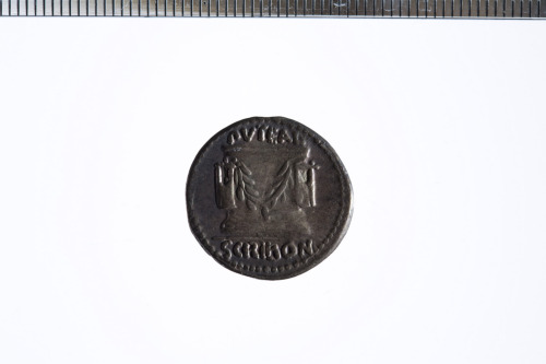 Dritto: Testa del Bonus Eventus a d.; c.p.. Rovescio: Il pozzo Scribonianum decorato con una ghirlanda e due lire; alla base, un martello; c.p.