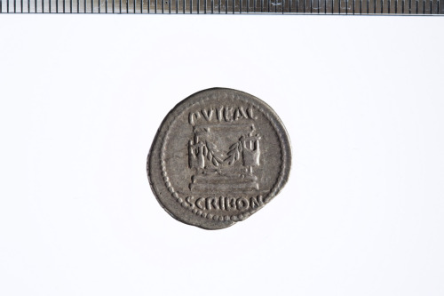 Dritto: Testa del Bonus Eventus a d.; c.p.. Rovescio: Il pozzo Scribonianum decorato con una ghirlanda e due lire; alla base, un martello; c.p.