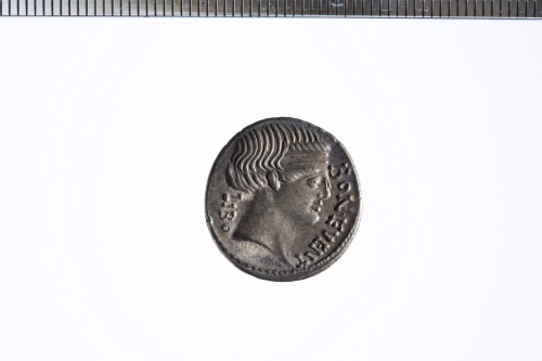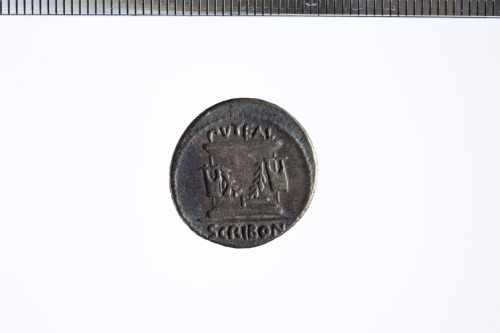 Dritto: Testa del Bonus Eventus a d.; c.p.. Rovescio: Il pozzo Scribonianum decorato con una ghirlanda e due lire; alla base, un martello; c.p.