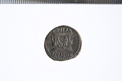 Dritto: Testa del Bonus Eventus a d.; c.p.. Rovescio: Il pozzo Scribonianum decorato con una ghirlanda e due lire; alla base, un martello; c.p.