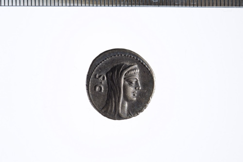 Dritto: Testa velata di Vesta a d.; c.p.. Rovescio: Coltello, culullus e ascia; c.p.