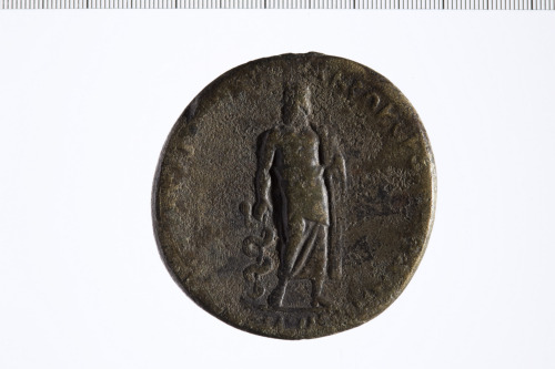 Dritto: Busto di Antonino Pio a d., drappeggiato.. Rovescio: Asclepio stante di faccia con testa a s. si appoggia al bastone con serpente attorcigliato.
