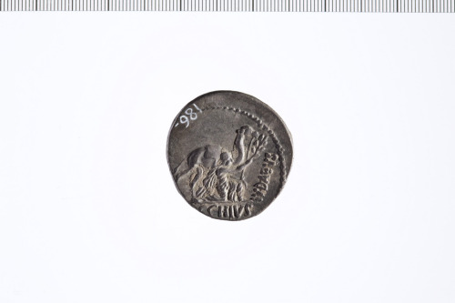 Dritto: Testa di Cibele a d. Cerchio perlinato.. Rovescio: Cammello a d.; davanti figura inginocchiata tiene le redini nella mano s. e un ramo di ulivo nella d. Cerchio perlinato.