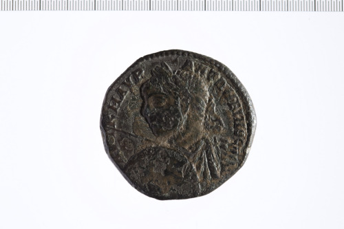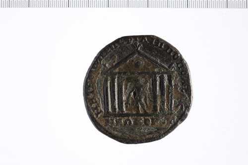 Dritto: Busto di Caracalla a s., visto da dietro, laureato con scudo e lancia.. Rovescio: Tempio esastilo con Bacco stante di fronte con grappolo d'uba nella mano d. e tirso(?) nella s.