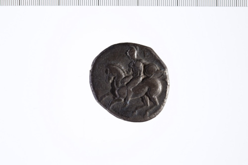 Dritto: Cavaliere galoppa a s. con scudo nella mano s.. Rovescio: Taras cavalca il delfino a d.; sotto un polipo.