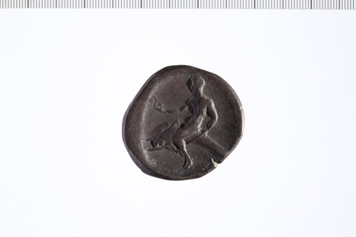 Dritto: Cavaliere galoppa a d.; sotto capitello di colonna dorica.. Rovescio: Taras cavalca il delfino a s.
